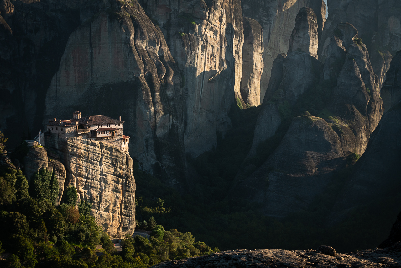«The holy Meteora monasteries» – the miracle of Greece. Few kilometers northwest of the town of Kalabaka, the impressive rocks of Meteora are rising from the plains of Thessaly been one of the most amazing places in Greece. Many centuries ago, on these gigantic rocks with the breathtaking landscape reaching heights of more than 600 meters, it was formed one of the most important monastic communities of Greece. The Greek word Meteora means “suspended in the air” and this phrase aptly describes these remarkable Greek Orthodox monasteries.The
